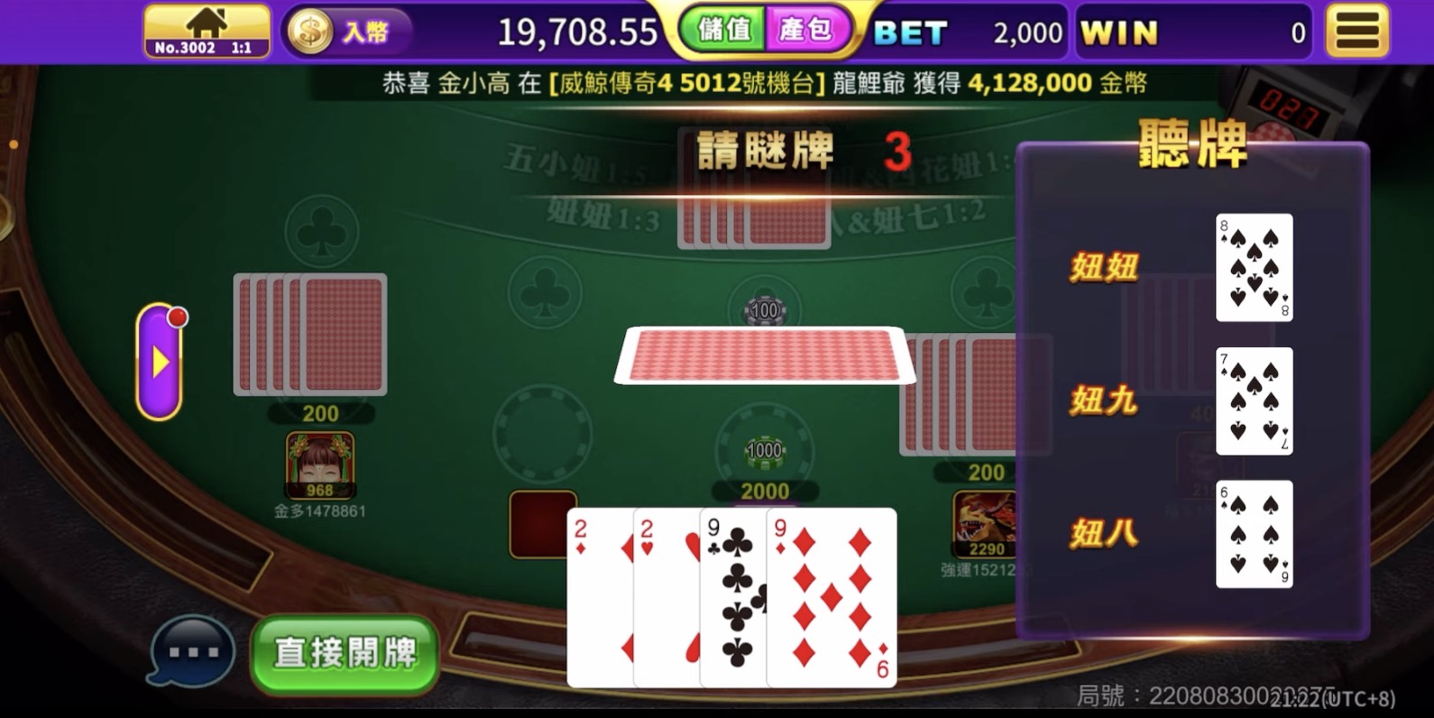 | 牛8 | 3張10的倍數 + 2張總和為8、18 | 第三高的牌型,點數組合滿足牛8條件 |